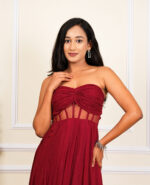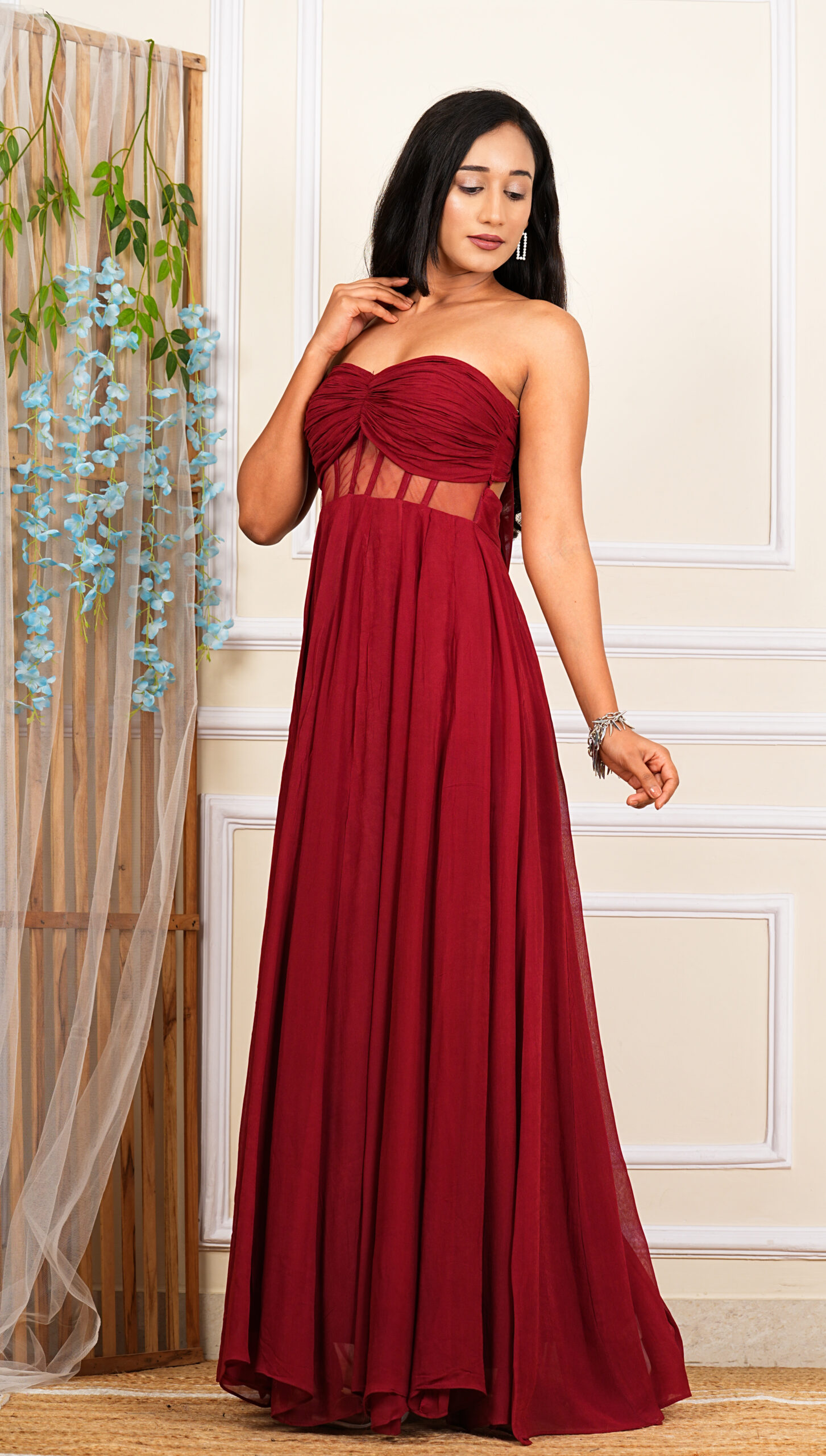 Channel your inner mystery with the Luxe Georgette Long Dress. This captivating piece embracesThe long, flowing silhouette exudes grace and elegance, while the strappy sleeves design adds a touch of allure. Crafted with meticulous attention to detail, this dress is perfect for formal events or special evenings